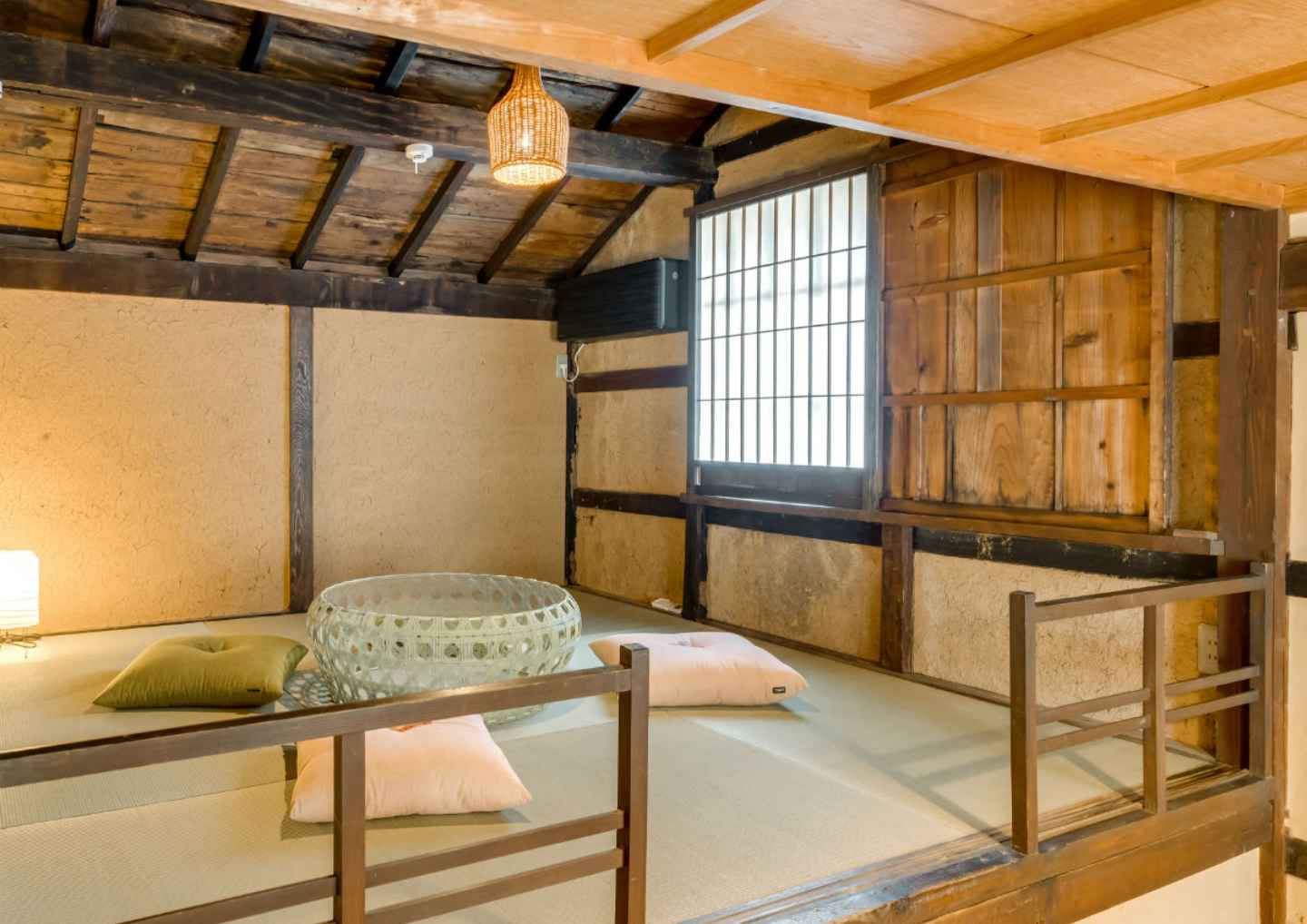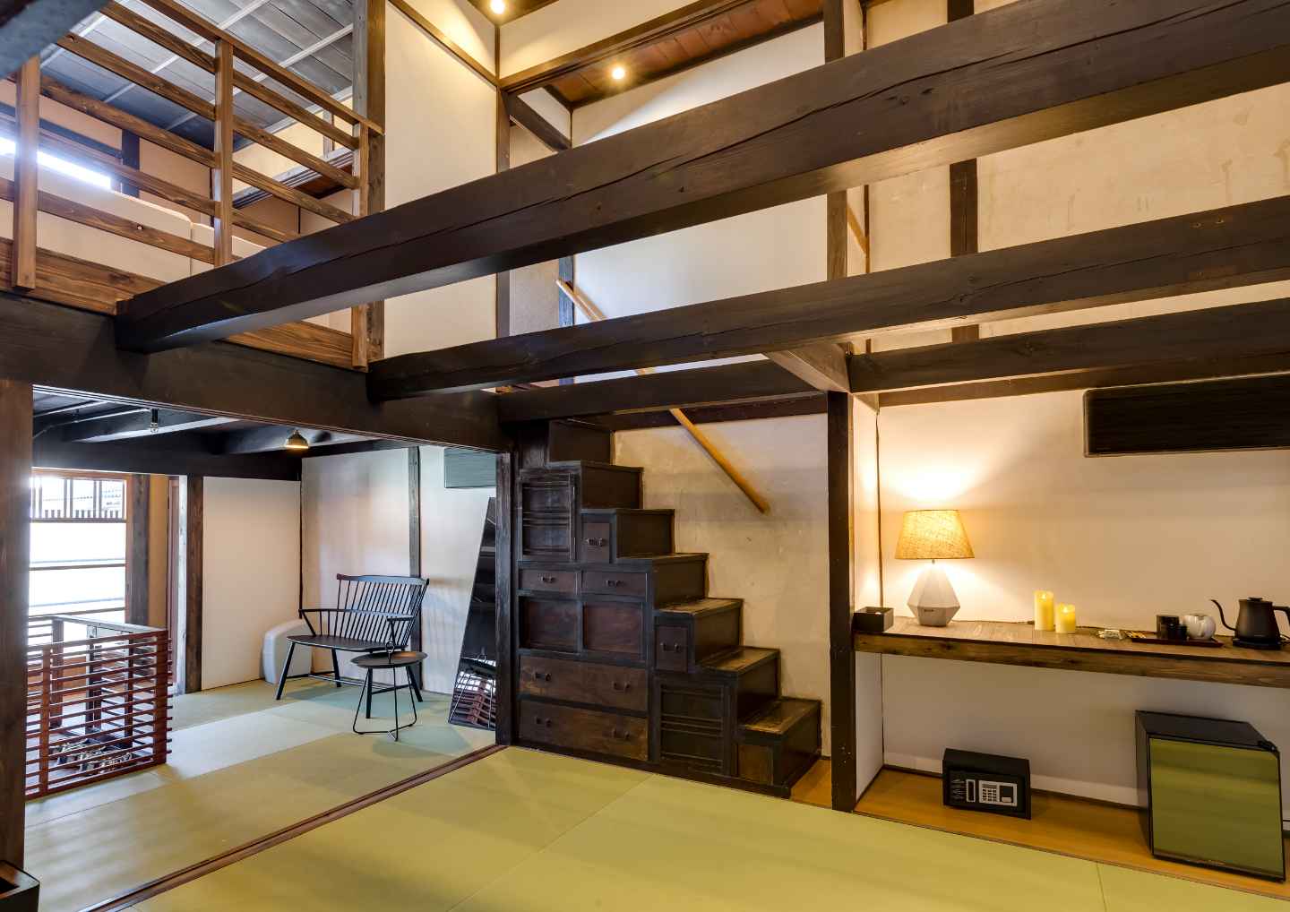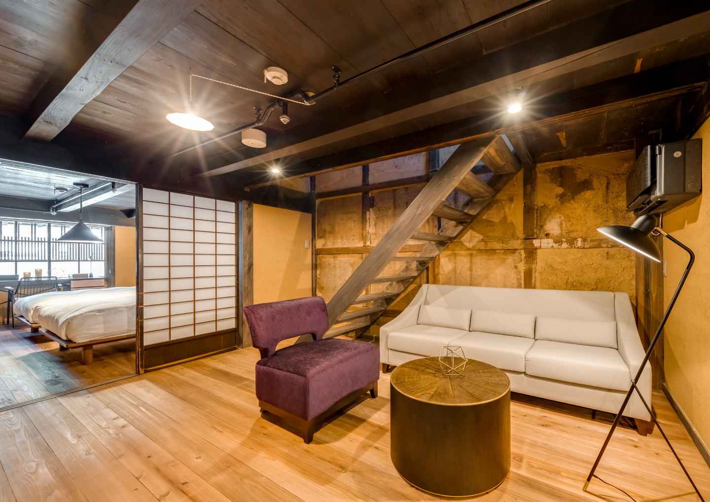 土間や梁、土壁の風合いや、メゾネットならではの隠れ家のような雰囲気など、「歴史建築に泊まる」体験を存分に満喫できるお部屋。もとの特徴を生かしたユニークな造りながら、モダンに改修され、快適にお過ごしいただけます。