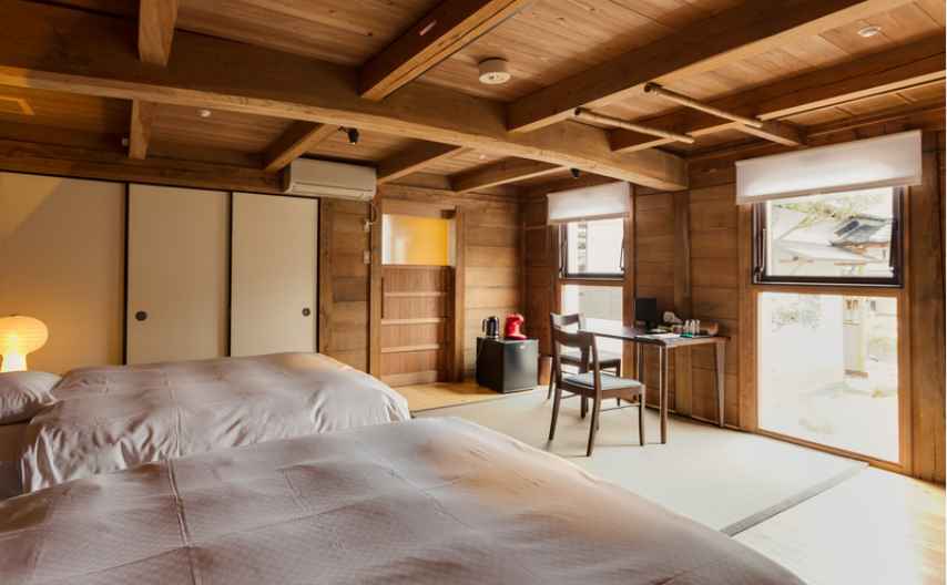 ホテルENを代表する母屋にあるお部屋で、フロントやダイニングまでのアクセスが最も便利です。酒造場だったころの面影が色濃く残り、木の香りがとても良いお部屋です。その希少性は有形文化財に登録されています。