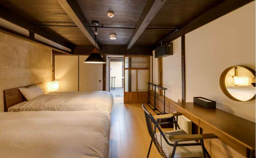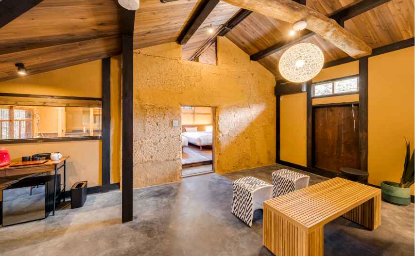 土間や梁、土壁の風合いや、メゾネットならではの隠れ家のような雰囲気など、「歴史建築に泊まる」体験を存分に満喫できるお部屋。もとの特徴を生かしたユニークな造りながら、モダンに改修され、快適にお過ごしいただけます。