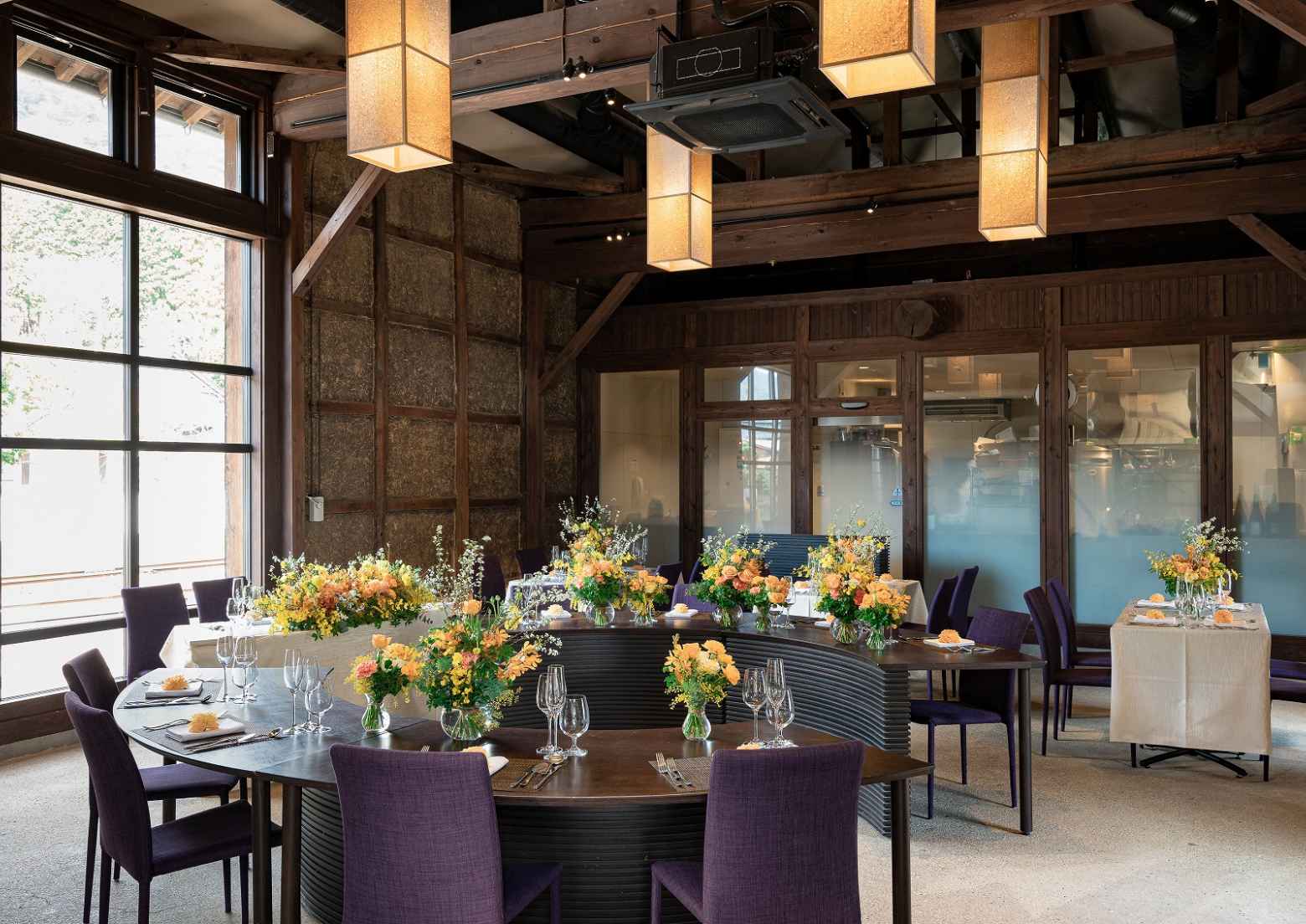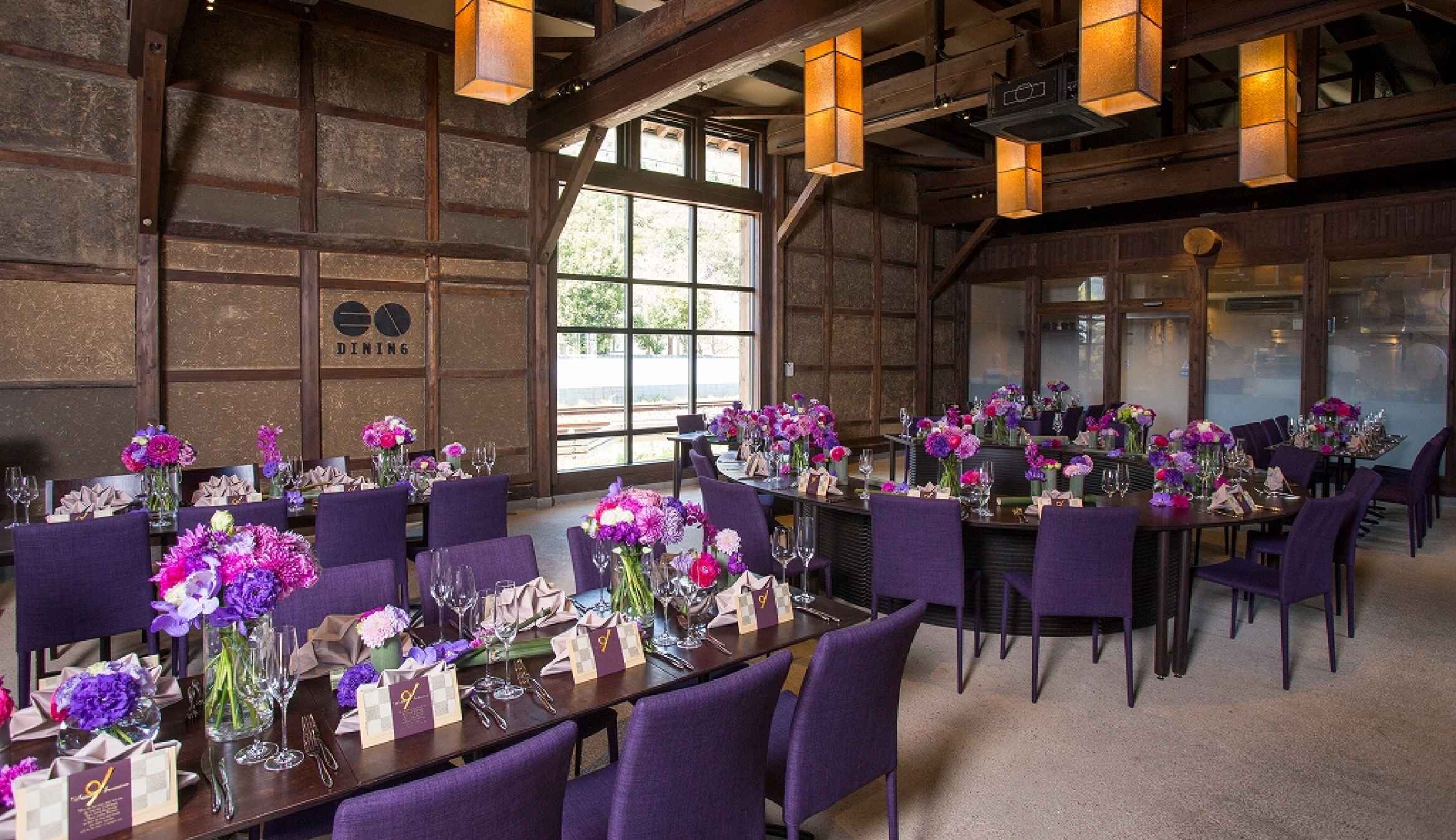 天井が高く開放的なダイニングはウエディングパーティなど、お祝いごとに相応しい華やかな雰囲気。天井から覗く梁、ぬくもり宿る土壁など伝統的な建築様式がゲストの心をホッと和ませ、アットホームな空間を創り出します。
