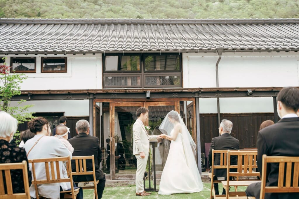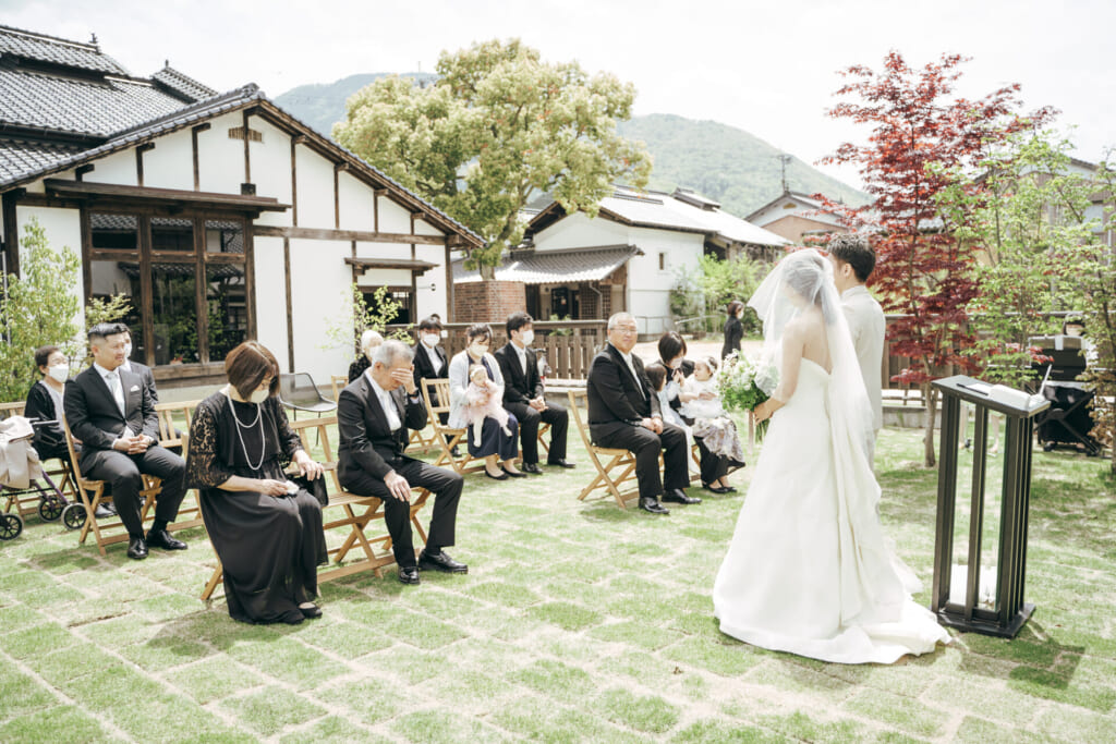 竹田城 城下町 ホテルENにただよう、落ち着いた雰囲気や緑豊かなガーデンに魅力を感じてくださったおふたり。ご両家からのアクセスもほどよい場所だったことから、ENでの結婚式をお決めくださいました。さらに、オンラインでお打合せができることも一つの決め手に。海外にいながらでも、スムーズに結婚式の準備を進めていただけます。