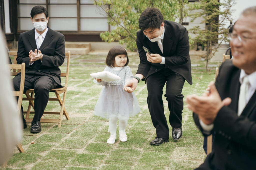 穏やかな春の陽気に包まれて、今日という晴れの日を迎えられたおふたり。ガーデン挙式にふさわしい、絶好の日和となりました。愛らしいお子様たちが会場の雰囲気に華を添え、和やかなムードで挙式がスタート。ゲストのあたたかな拍手に迎えられて、新郎様がご入場されました。新婦様は、お父様にエスコートしていただきながらご入場。思わず感情がこみ上げたお父様のお姿が、深く心に刻まれるシーンとなりました。指輪交換シーンでは、リングガールとしてお子様ゲストがご登場。小さな手で、新郎様新婦様の元へ一生懸命指輪を届けてくださいました。ゲスト参加型のオリジナルの結婚証明書に署名され、永遠の愛を皆様の前で誓われたおふたり。ゲストおひとりおひとりとの結びつきも強められた、アットホームな挙式となりました。