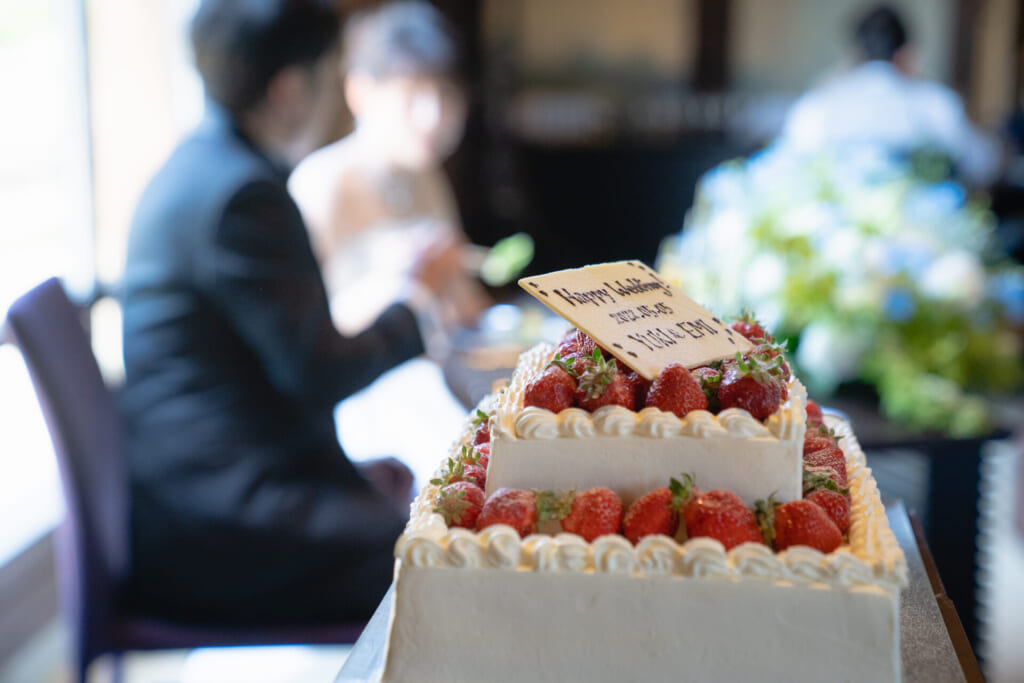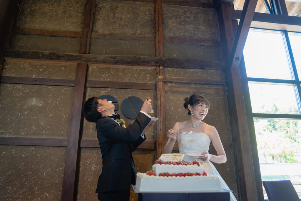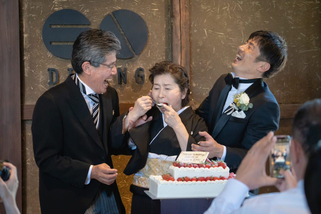 ご披露宴では、新婦様のお父様に詩吟をご披露いただきました。ご披露されたあとは会場中が盛大な拍手に包まれ、熱気が高まりました。ご家族中心の式だからこそ、賑やかでアットホームな雰囲気が自然と作り上げられていきました。おふたりの満面の笑みが浮かぶ幸せいっぱいなファーストバイトのあと、ご両家の親御様によるバイトも執り行われることに。サプライズで親御様をお呼びしたところ、照れながらもどこか嬉しそうな表情でケーキの前へお立ちになりました。ご両家の親御様の仲睦まじさが伝わってくる、とても素敵なひとときでした。