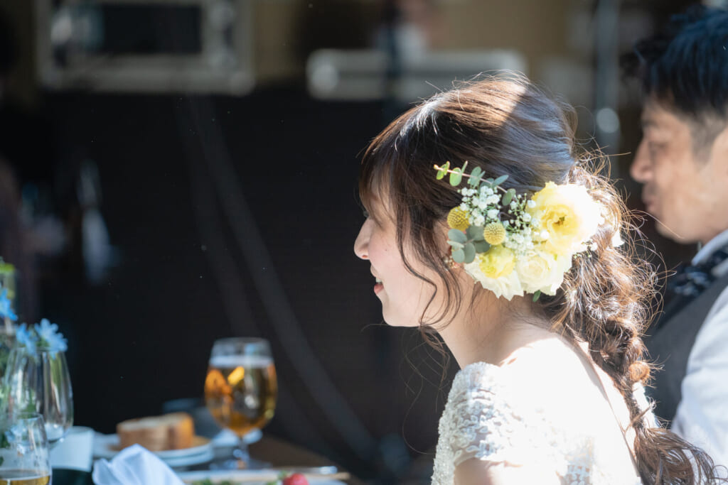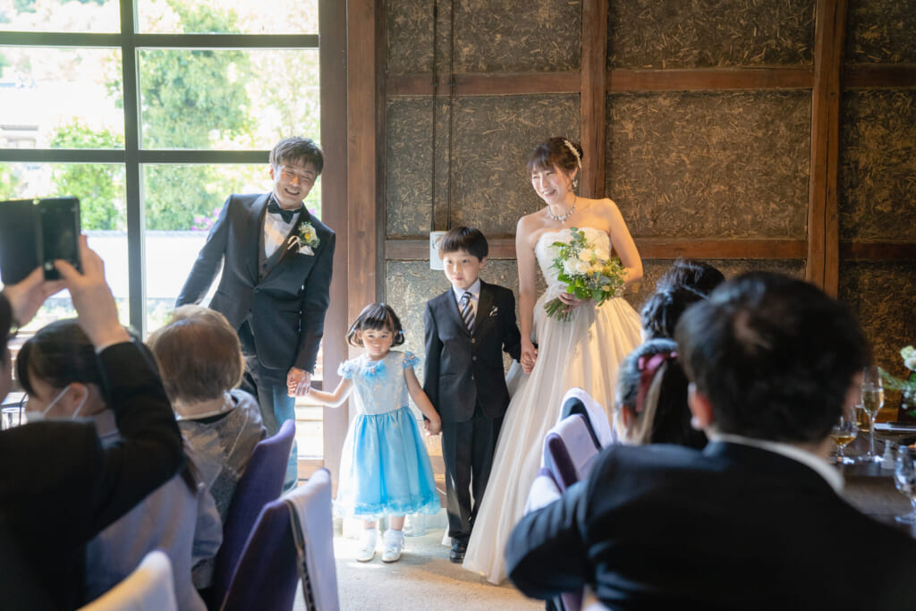 新郎様新婦様が中座される際、エスコート役としてご親戚のお子様のご登場。当日は10名のお子様がご列席くださり、そのお一人おひとりにスポットライトがあたるようなご演出を、おふたりはお考えくださいました。お色直し入場では、新郎様はジャケットをお脱ぎになったカジュアルな装いで、新婦様はヘアスタイルをチェンジされてのご登場。ナチュラルなブーケとマッチした、華やかなヘッドドレスを身に着けていらっしゃいました。ご衣裳は同じものでも、先ほどまでとは異なる雰囲気をまとった素敵なお色直しでした。